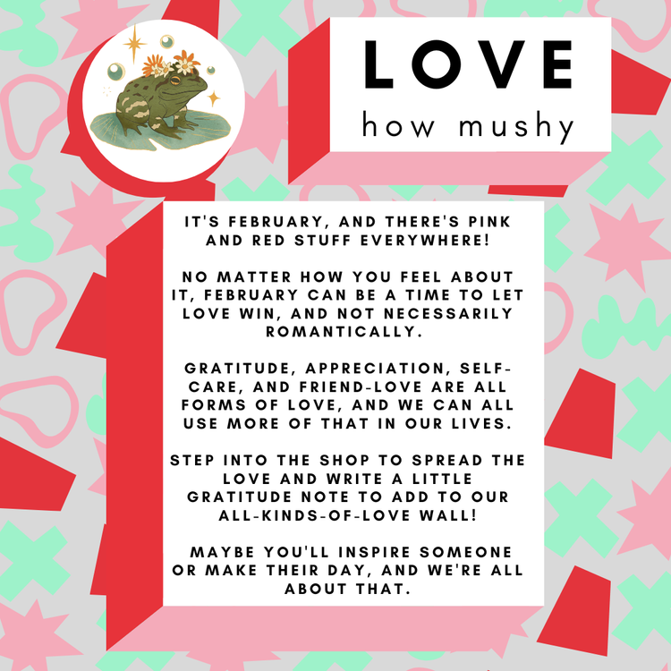 This month we're showcasing unique ways in which we can all spread and show love. We'd love for you to come by the store and add to our all-kinds-of-love wall!